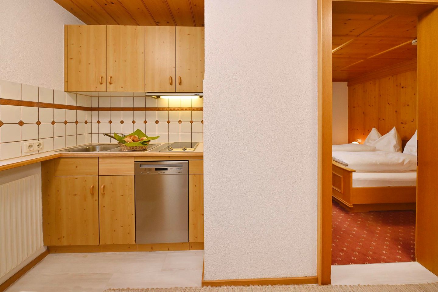 Die kompakte Küche ist praktisch ausgestattet und verfügt über einen kleinen Vorraum sowie Zugang zum Balkon – ideal für ein Frühstück an der frischen Bergluft.